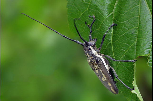云斑天牛白天栖息在树干和大枝上,有趋光性,晚间活动取食,啃食嫩枝皮层和叶片,有咔嚓咔嚓响声,最大取食量1天可达100平方厘米。成虫在林内生活约40天,受惊时即坠地。